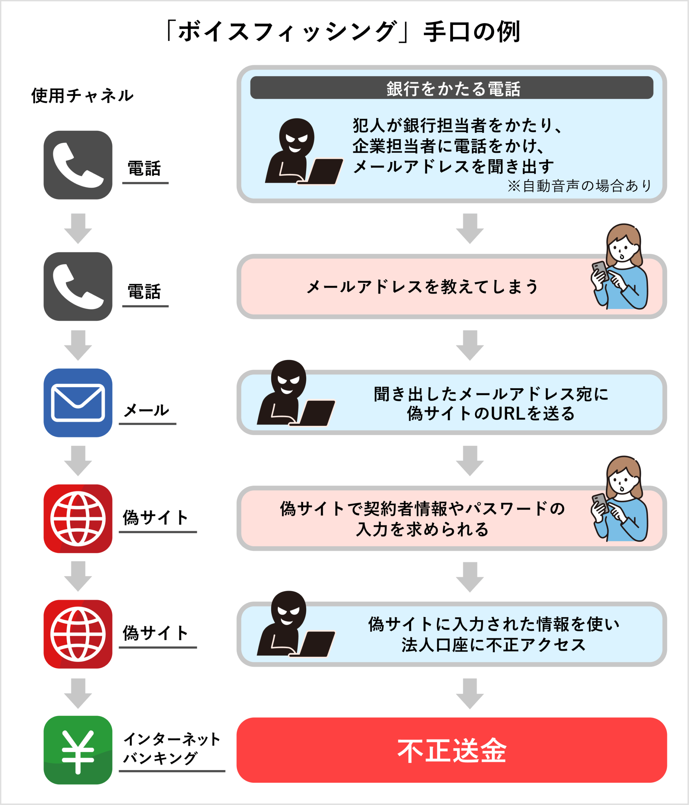 金融機関や宅配事業者などを名乗る自動音声電話を入り口に、メールやSMSで偽サイトへ誘導し、銀行口座情報や認証コードなどを盗み取る手口です。